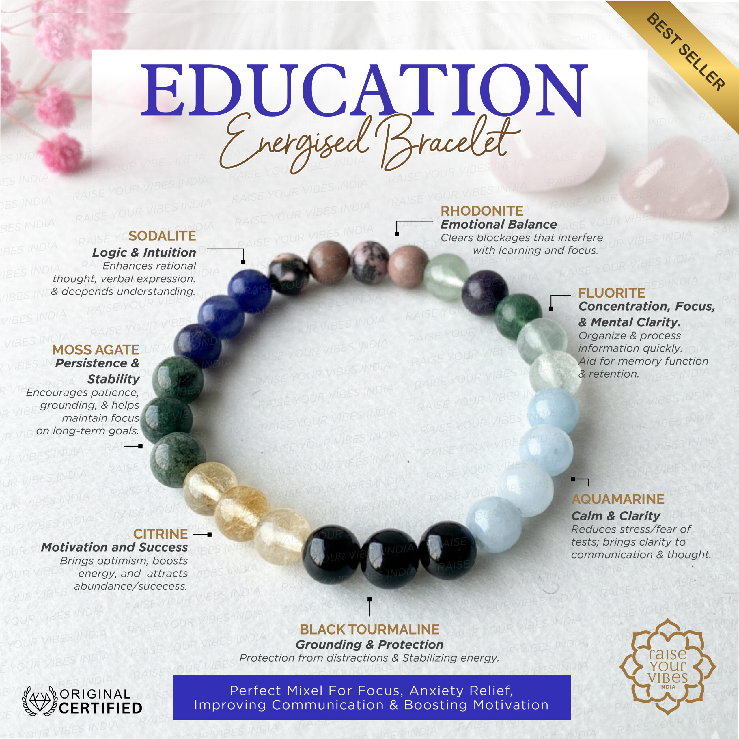 🔹 BLACK TOURMALINE has a gentle energy & reduces fears, improves memory & focus which helps not to forget the information longer. A powerful grounding stone that absorbs negative energy and external distractions, creating a clear, protected space for study and preventing electromagnetic fog (EMF) from devices.